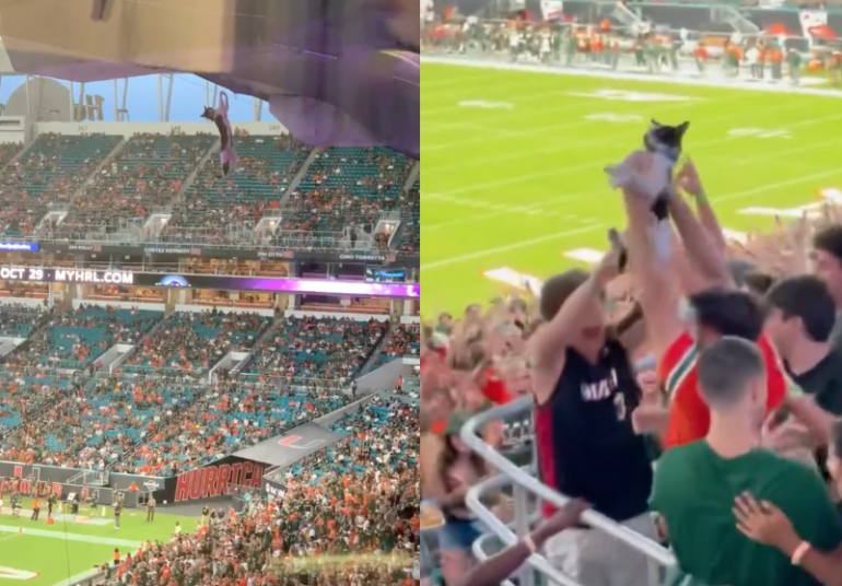 It was a cat. Fans at a Miami Hurricanes game caught a cat with an American flag after the animal fell from an upper level of the stadium on Sept. 22 Miami and Appalachian State didnt even happen on the field.